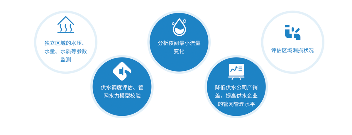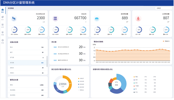 分区计量是实现区域供水统计分析的基础,有助于及时发现并定位供水异常,开展区域产销差管理。可以实现水量、压力的综合分析,通过爆管预警、最小流量预警快速定位漏损发生区域,从而及时跟进管网调度、工程维修,提升漏损控制管理水平。