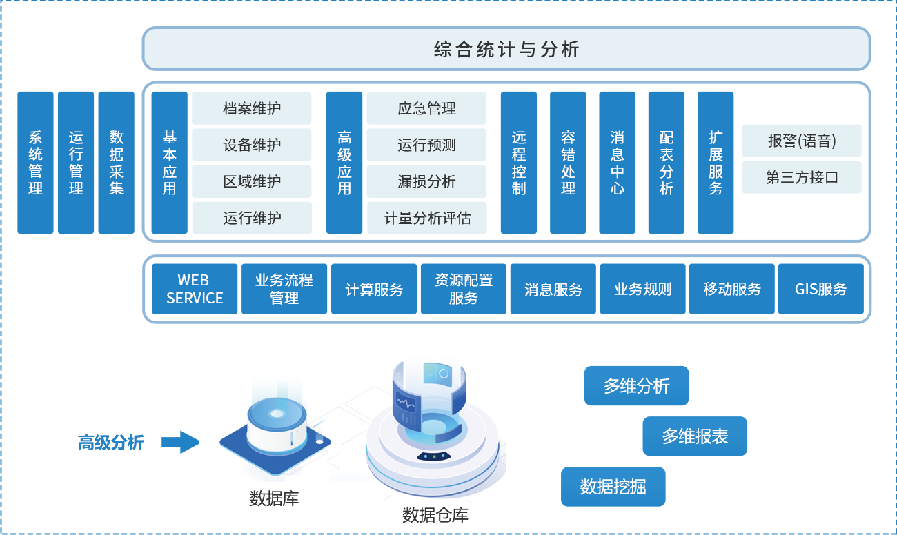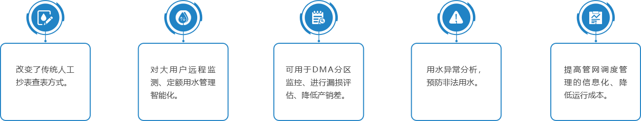 主要功能包括驾驶舱、立户报装、批量导入、水表状态、报警处理、问题水表、拆表管理、水量分析、实时列表、单点分析、月数据分析、区域维护、规格维护、系统参数设置等,既可及时发现管网供水异常,又可测算出区域的漏损情况、并辅助查找漏点,有效降低管网漏损率和产销差率。