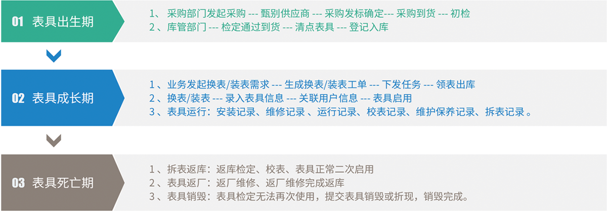 该系统是一套为水表生命周期管理流程而开发的系统软件,实现对水表从入库、运行到报废的整个生命周期进行信息化的全程跟踪、记录与管理,使管理扁平化、数据可视化、评价透明化,形成水表生命周期全流程闭环管理系统。