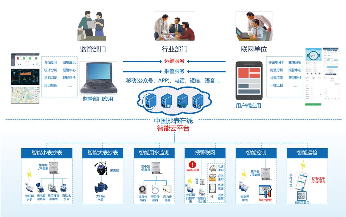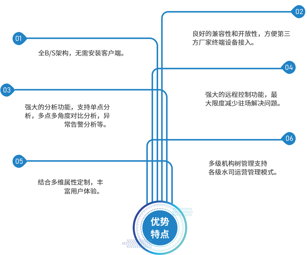 主要功能包括自动抄表、综合数据管理分析、系统及表计设备工况实时监测、网络信息发布及查询、报表上传、远程控制、多媒体告知等,可避免错抄、漏抄、估抄和偷、送水现象的发生,从而有效提高抄表质量、抄表效率和经济效益,还可促进水司节能减排,提高运行管理水平,更好的为区域居民提供舒适、便利和人性化服务的目标。