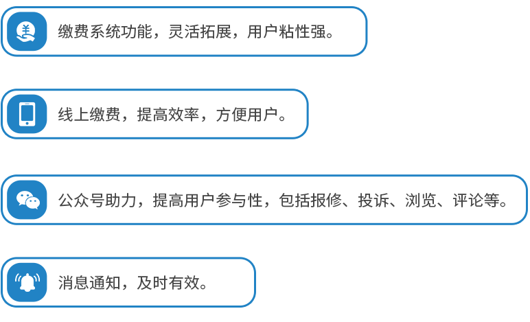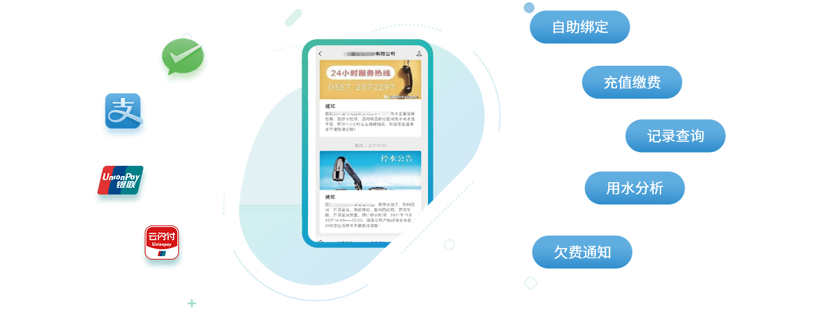 该系统支持用户自助绑定,使用微信、支付宝、银联等渠道进行在线缴费,查询缴费记录和用水情况,欠费通知,管理员可以导入不同的用户,设置预警值、查看统计、消息在线推动,用户可以在线报修等其他。